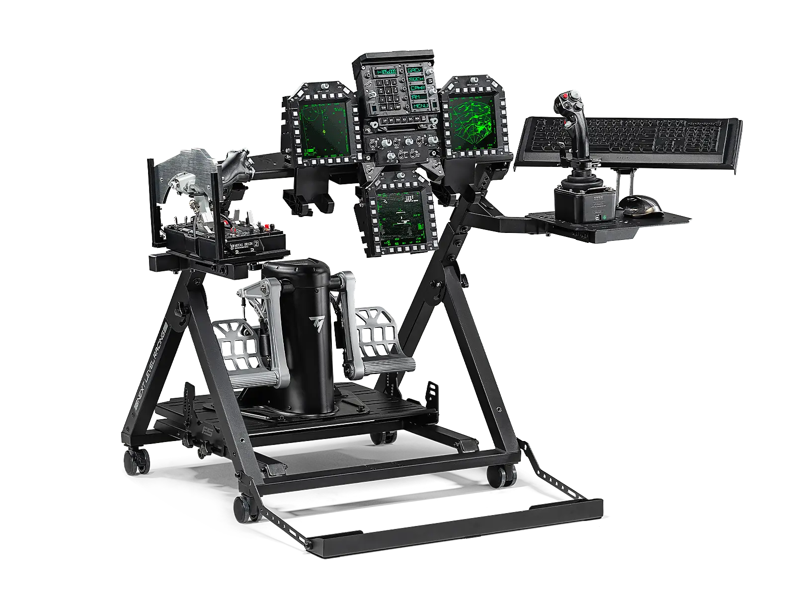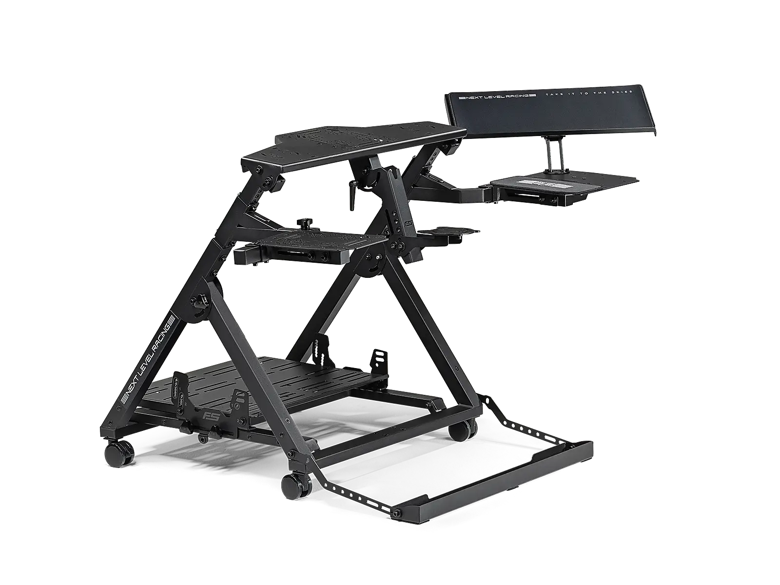 Introducing the Next Level Racing® Flight Stand Pro – the ultimate flight simulation experience. With support for commercial, general aviation, and military configurations, this flight stand offers an authentic simulation experience. The centre HOTAS mounting pole with height and angle adjustment allows for true military configuration, and compatibility with major flight electronics. The wide frame design and rudder pedal plate with angle, height, and lateral adjustment accommodates a wide range of rudder pedals. Adaptable to any space, this stand is equipped with castor wheels that allow for easy transportation. The swivel flight arm and mouse/keyboard holder with angle adjustment provides a range of adjustment with customization opportunities. The Flight Stand Pro offers limitless possibilities for your flight simulation. Upgradeable to the full Flight Simulator Pro cockpit with the addition of the Next Level Racing® Flight Seat Pro*. For a more immersive experience, the Flight Stand Pro is also compatible with Next Level Racing® Motion Plus Platform and Motion Platform V3 **.