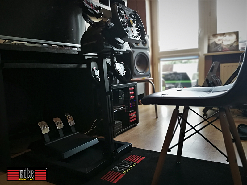 レースが終わったら片付けましょう!特許申請中の設計は、素早い収納を目的にスタンドが10秒以内で畳める造りになっています。この独自のデザインで未使用時には周辺装備が設置されたままホイールスタンドを収納することができます。シミュレーションスペースの限られたユーザーに最適のスタンドです。
